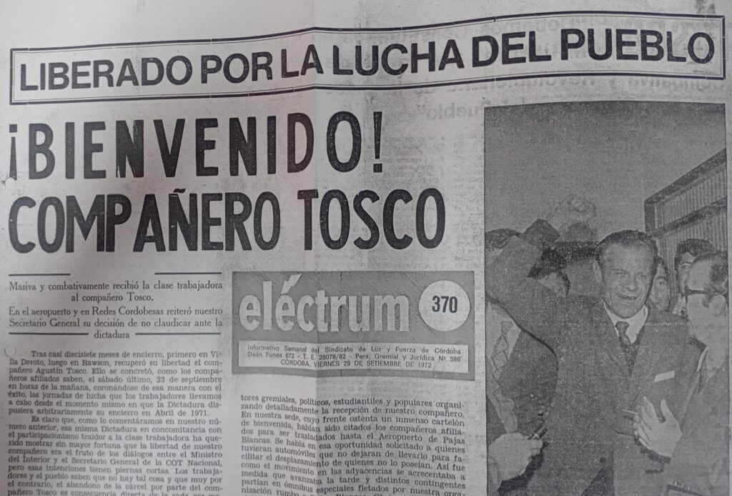 Tras casi diecisiete meses de encierro, primero en Villa Devoto, luego en Rawson, recuperó su libertad el compañero Agustín Tosco. Ello se concretó (…) coronándose de esa manera con éxito, las jornadas de lucha que los trabajadores llevamos a cabo desde el momento mismo en que la dictadura dispusiera arbitrariamente su encierro. Es claro que la dictadura en concomitancia con el “participacionismo” traidor a la clase trabajadora ha querido mostrar sin mayor fortuna que la libertad de nuestro compañero era el fruto de los diálogos, entre el ministro del Interior y el secretario General de la CGT Nacional, pero esas intenciones tienen piernas cortas. Los trabajadores y el pueblo saben que no hay tal cosa y que, muy por el contrario, el abandono de la cárcel por parte del compañero Tosco es consecuencia directa de la cada vez mayor presión ejercida con todos los medios por los sectores populares en lucha contra el régimen (…)
