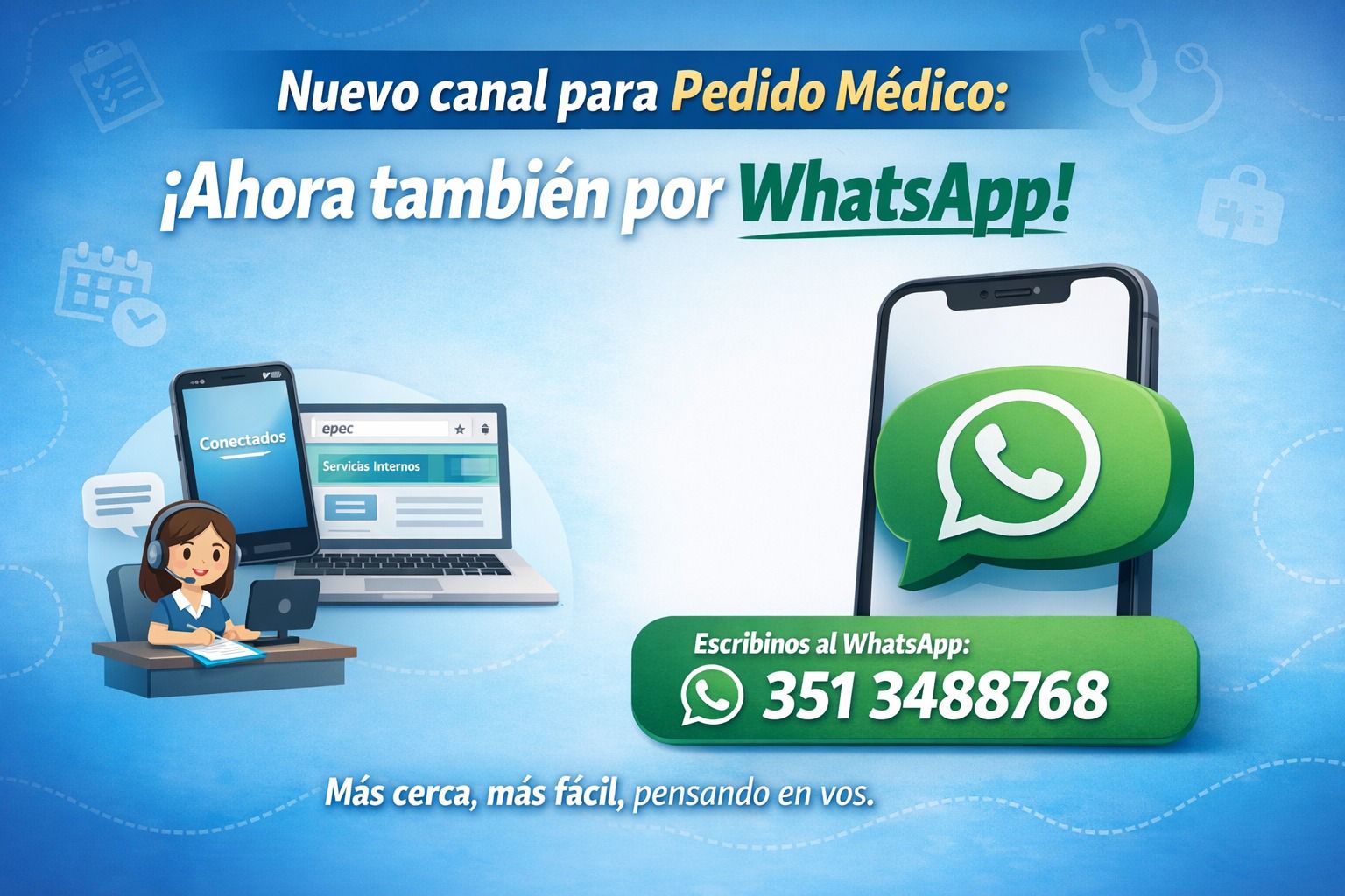 EPEC sumó un nuevo canal para facilitar el aviso de enfermedad y la presentación de certificados médicos. Ya se encuentra habilitada la línea de WhatsApp 3513488768, disponible las 24 horas, todos los días, que se incorpora a los medios ya existentes.
