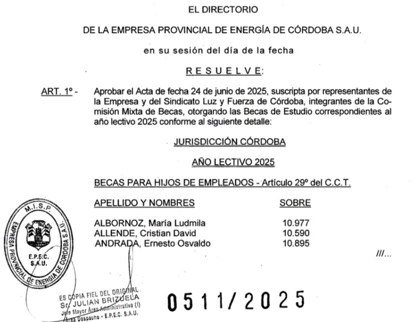 Mediante resolución N° 511/2025 se aprobó el acta suscripta entre la Empresa Provincial de Energía, el Sindicato de Luz y Fuerza de Córdoba y la Comisión Mixta de Becas, por la que se otorgan las becas de estudio correspondientes al corriente año para hijos de trabajadores en actividad, en los términos fijados en el artículo 29 del Convenio Colectivo de Trabajo. La totalidad del monto correspondiente al beneficio fue acreditada hoy viernes.
