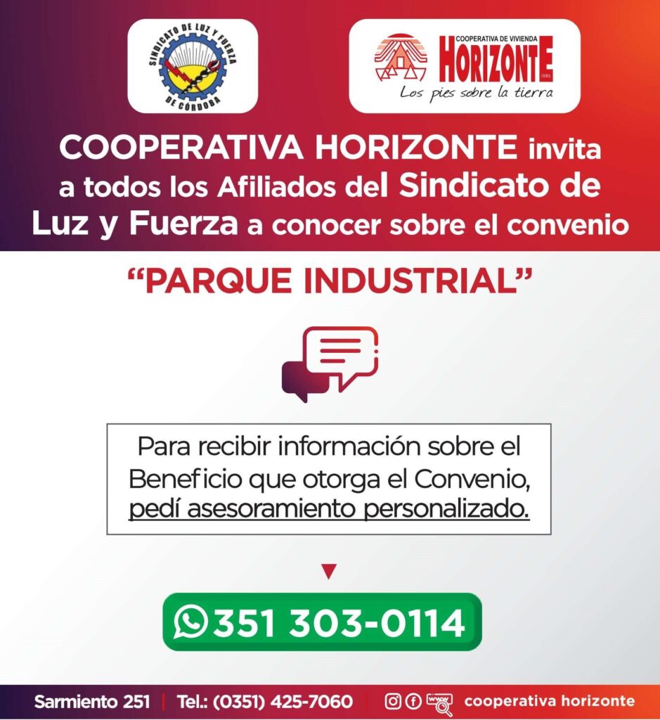 Por información y asesoramiento las y los afiliados interesados pueden acercarse a las oficinas de la Cooperativa Horizonte (Sarmiento 251) o bien comunicarse vía WhatsApp al 351 303-0114, donde recibirá asesoramiento personalizado.