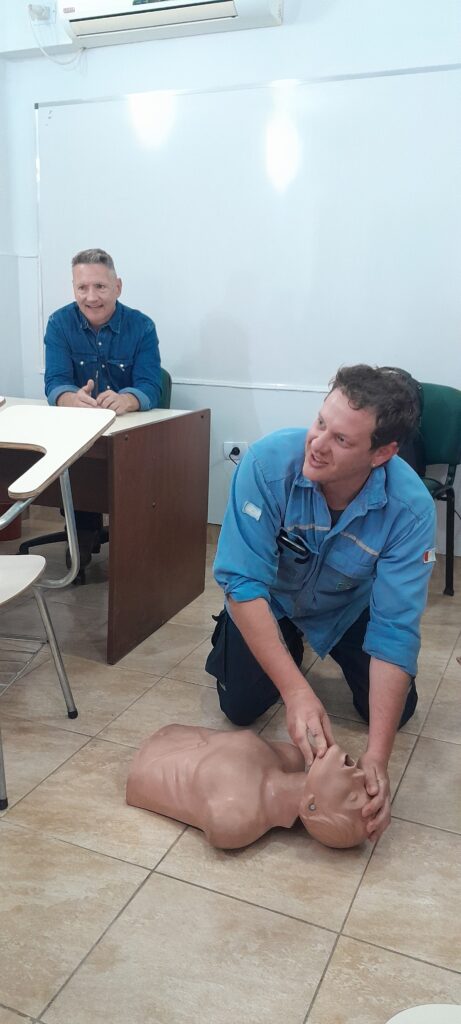 Dicha capacitación fue dictada por el Dr. Diego Caviglia de Div. Medicina del Trabajo, quien en primer lugar explicó cómo realizar la maniobra de Heimlich en caso de obstrucción de las vías respiratorias por ahogamiento con algún elemento externo.