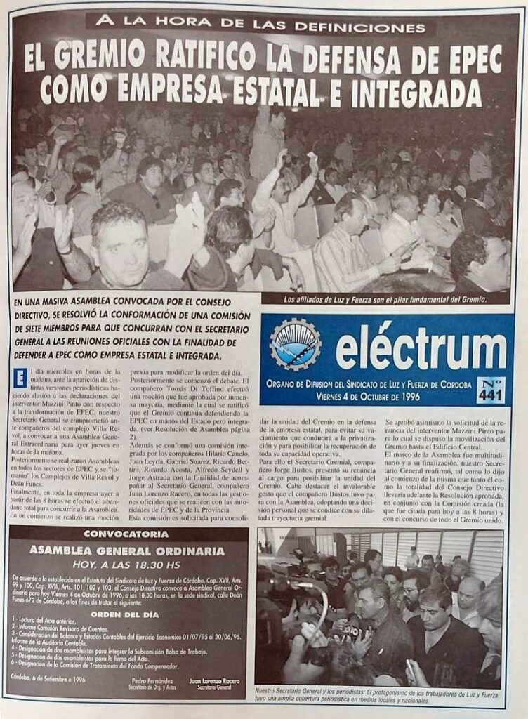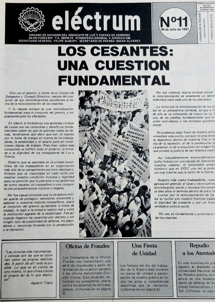 Es así que, en septiembre de 1953, apareció el primer número de Eléctrum impulsado y dirigido por Agustín Tosco. Destacaba su primer número: “…el primer acto es saludar y estrechar muy fraternalmente a todos los trabajadores argentinos y a todos los trabajadores de forman la humanidad (…) Eléctrum tiene trazado un recto camino y su campo es fértil. Es el símbolo máximo de la autenticidad de las conquistas sociales obtenidas por los trabajadores y será la clara expresión de su sentir”.