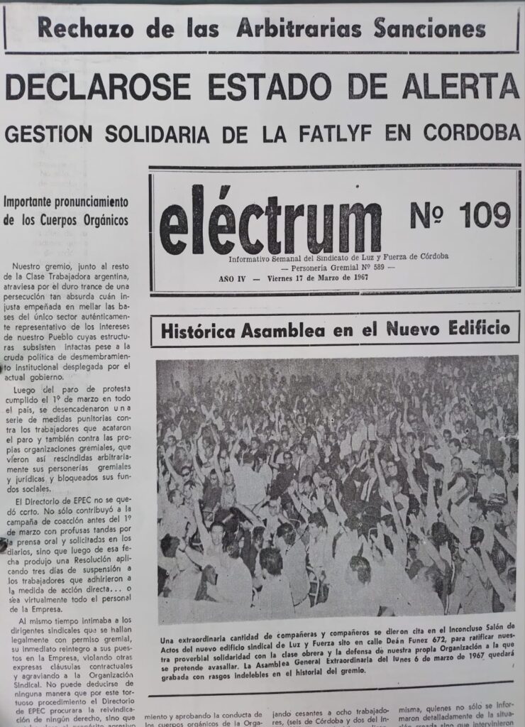 El 6 de marzo de 1967 se materializaba un anhelo de muchos años: se inauguró la nueva sede sindical de Deán Funes 672 y el bautismo fue con una multitudinaria asamblea del gremio. En lo que hoy es el salón auditorio “Agustín Tosco”, se resolvió unánimemente un plan de lucha en respuesta a las cesantías, represión y el ajuste de la dictadura militar por el contundente paro nacional del 1º de marzo.