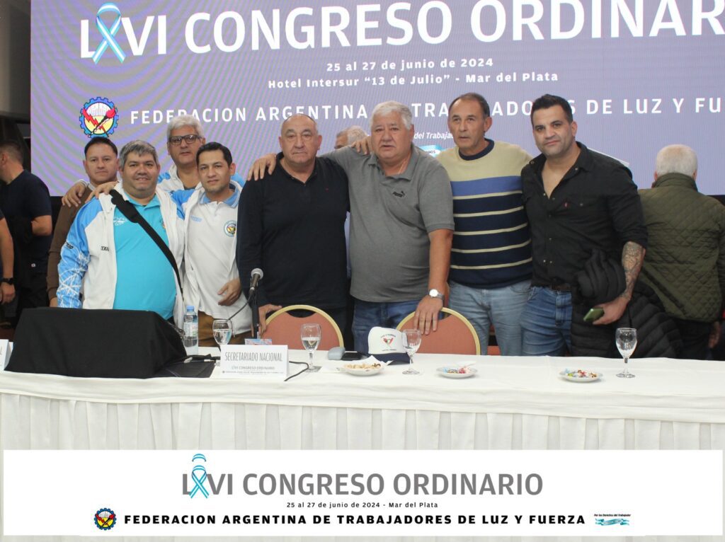 Nuestro sindicato participó del LXVI Congreso Ordinario de la Federación Argentina de Trabajadores de Luz y Fuerza, que se desarrolló del 25 al 27 de junio en el Hotel “13 de julio” de Mar del Plata, con la presencia de los 41 sindicatos afiliados. La delegación de nuestro Sindicato estuvo encabezada por nuestro Sec. Gral. Jorge Molina Herrera, que asistió junto a los compañeros Ezequiel Martínez, Germán Agüero, Juan Alaniz, Gustavo Vives, Claudio Pino, Marcos Pereyra y Héctor Pérez.