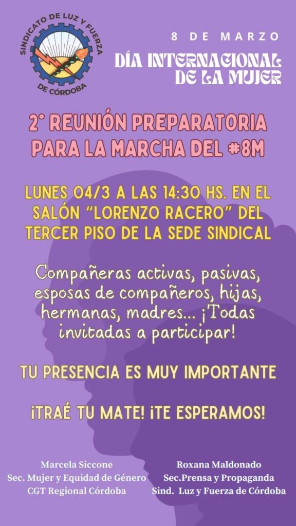 Las compañeras Marcela Siccone, Secretaria de la Mujer y Equidad de Género de la CGT Regional Córdoba, y Roxana Maldonado, Secretaria de Prensa y Propaganda de nuestro Sindicato, con el acompañamiento de todo el Consejo Directivo, se encuentran impulsando estas iniciativas e invitan a todas a participar de la próxima reunión (ver flyer) y de la marcha del #8M, sobre la que se acordó convocar para las 17 hs., del viernes 08/3 en nuestro Sindicato, para desde allí marchar por calle Deán Funes hasta el AGEC, donde nos encontraremos con otras compañeras de la CGT, para finalmente sumarnos a la marcha, que culminará con la lectura de un documento frente a Patio Olmos.