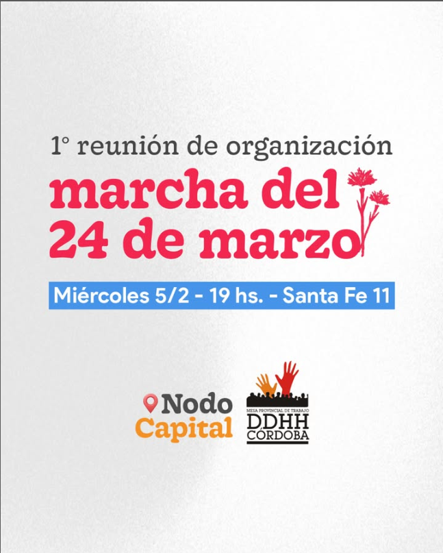 Te invitamos a sumarte a la 1° reunión de organización de la marcha del 24 de marzo del Nodo Capital de la Mesa de Trabajo por los DDHH de Córdoba