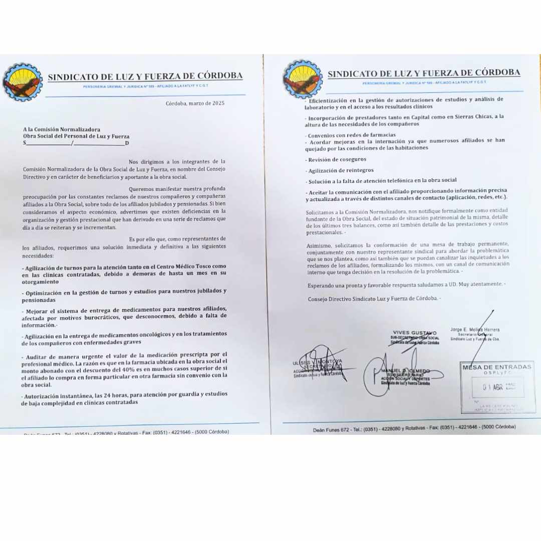 El pasado martes 1 de abril nuestro Sindicato presentó una nota dirigida a la Comisión Normalizadora de la Obra Social de Luz y Fuerza, donde se manifestó la preocupación por las constantes demandas de nuestros compañeros y compañeras, sobre todo de los afiliados jubilados y pensionadas, advirtiendo que, sin desconocer el contexto económico, existen deficiencias en la organización y gestión prestacional que han derivado en una serie de inconvenientes que día a día se reiteran y se incrementan.
