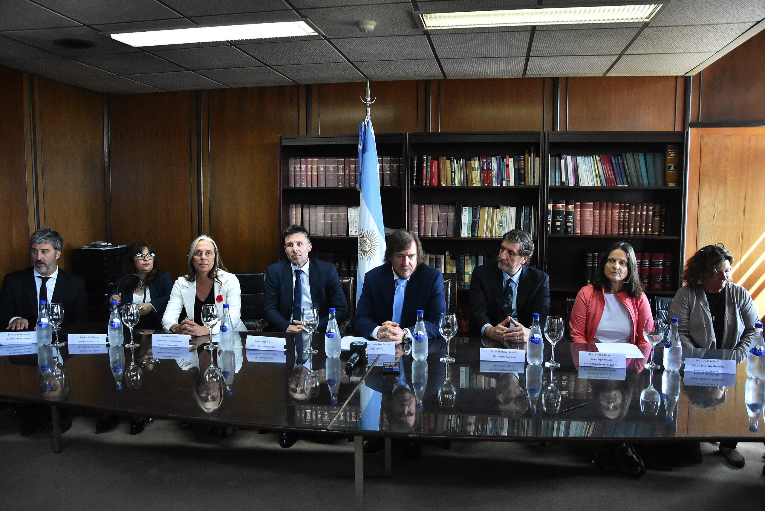 Ramiro Fresneda, Patricia Chalup, la ministra de Desarrollo Humano Liliana Montero, el fiscal federal Facundo Trotta, el juez federal Miguel Vaca Narvaja, el secretario de DDHH Juan Miguel Ceballos y los miembros del EAAF Silvana Turner, Anahí Ginarte y Guillermo Sagripanti (no sale en la foto)