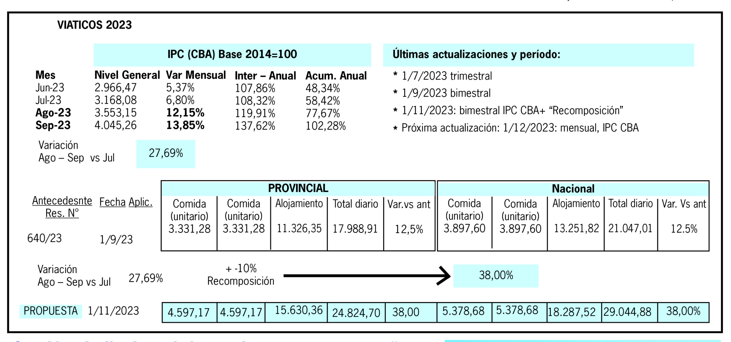 En virtud del tiempo transcurrido y la conformación de este déficit, logramos que al 27% de atraso se sume un 10% para establecer una recomposición del valor del viático en un 38%. Esta actualización, una vez emitida la resolución del directorio, tendrá vigencia a partir del 1 de noviembre.