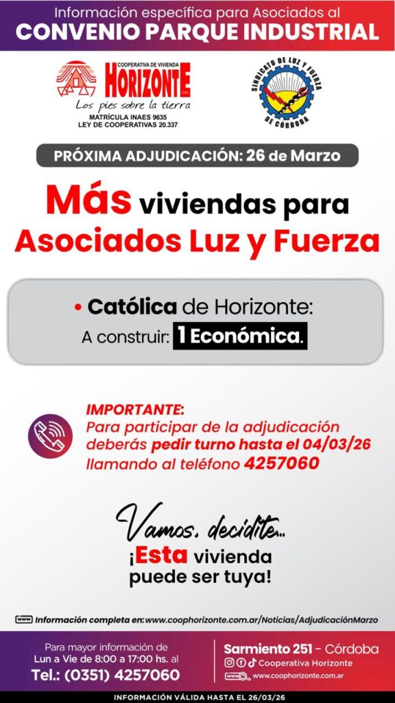 Para quienes se encuentren adheridos al Convenio con Horizonte, el próximo 26 de marzo se adjudicará la construcción de una Vivienda Económica en Católica de Horizonte.